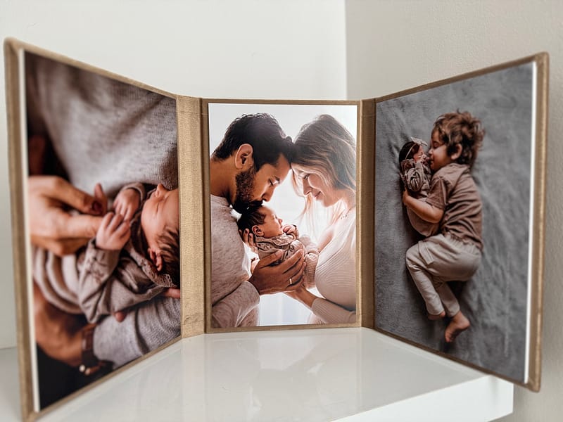 To 3 fotografie podklejone do eleganckiej ramki, oprawionej w tkaninę introligatorską, ekoskórę lub tkaninę aksamitną.